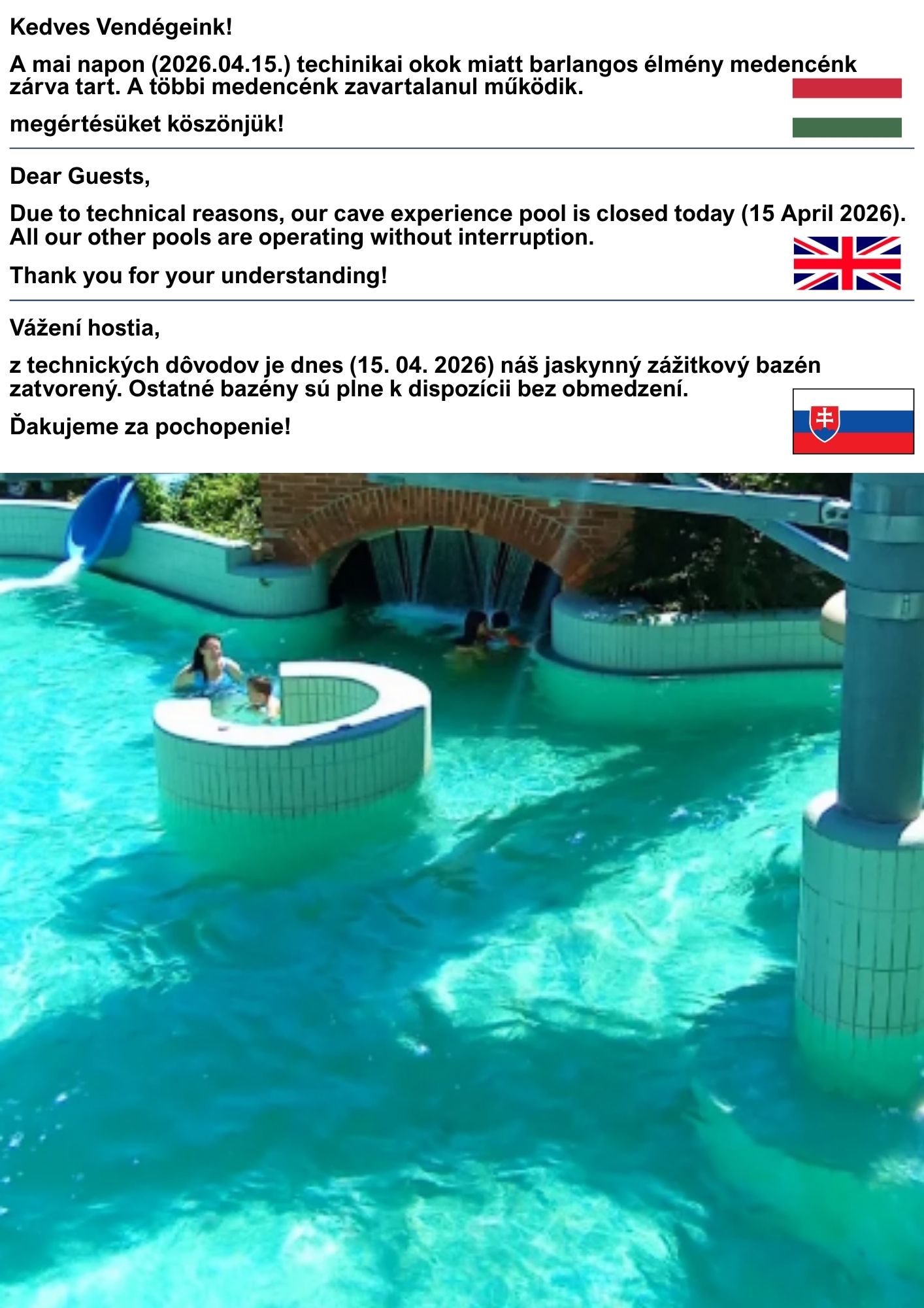 A sekélyebb vizű medence a 0–3 éveseket, a kicsit mélyebb a 3–7 éveseket szolgálja ki, illetve egy új hangjegy vízicsúszda nyújt még nagyobb élményt a gyerekeknek.
